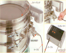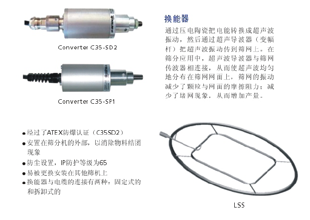 超聲波篩分係統由超聲波發生器、換能器、共gong振zhen環huan組zu成cheng。超chao聲sheng波bo發fa生sheng器qi產chan生sheng高gao頻pin震zhen蕩dang,由you換huan能neng器qi轉zhuan換huan成cheng高gao頻pin正zheng弦xian形xing式shi的de縱zong向xiang震zhen蕩dang波bo,這zhe個ge震zhen蕩dang波bo傳chuan到dao共gong振zhen環huan上shang使shi共gong振zhen環huan產chan生sheng共gong振zhen,然ran後hou有you共gong振zhen環huan將jiang振zhen動dong均jun勻yun的de傳chuan輸shu至zhi篩shai麵mian,篩shai網wang上shang的de物wu料liao在zai做zuo低di頻pin三san次ci元yuan振zhen動dong的de同tong時shi,疊die加jia上shang超chao聲sheng波bo振zhen動dong效xiao應ying,既ji可ke達da到dao防fang止zhi篩shai麵mian網wang孔kong堵du塞sai,又可提高篩分產量和質量。